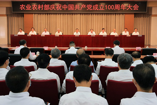 6月28日,农业农村部召开庆祝中 国共 产党成立100周年大会。中 央农办主任,农业农村部党组书记、部长唐仁健出席会议,为老党员代表颁发“光荣在党50年”纪念章,围绕学习百年党史、结合三农实际作专题党课报告,并对部党组党史学习教育专题读书班进行总结。